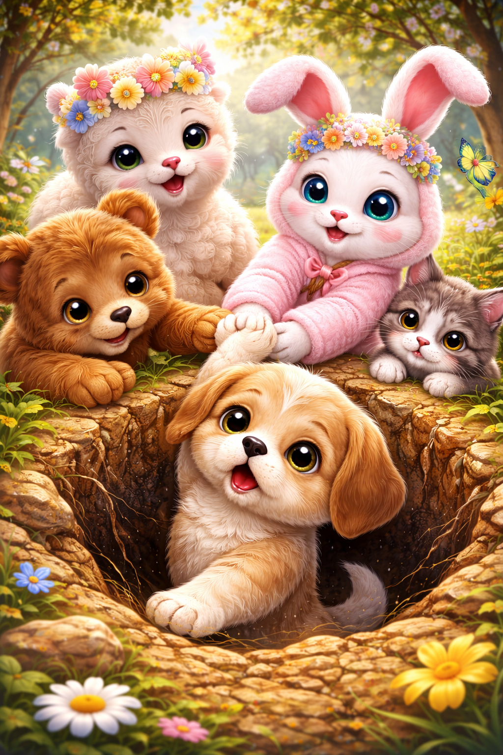 Binky sprong meteen op en knuffelde zijn vriendjes.