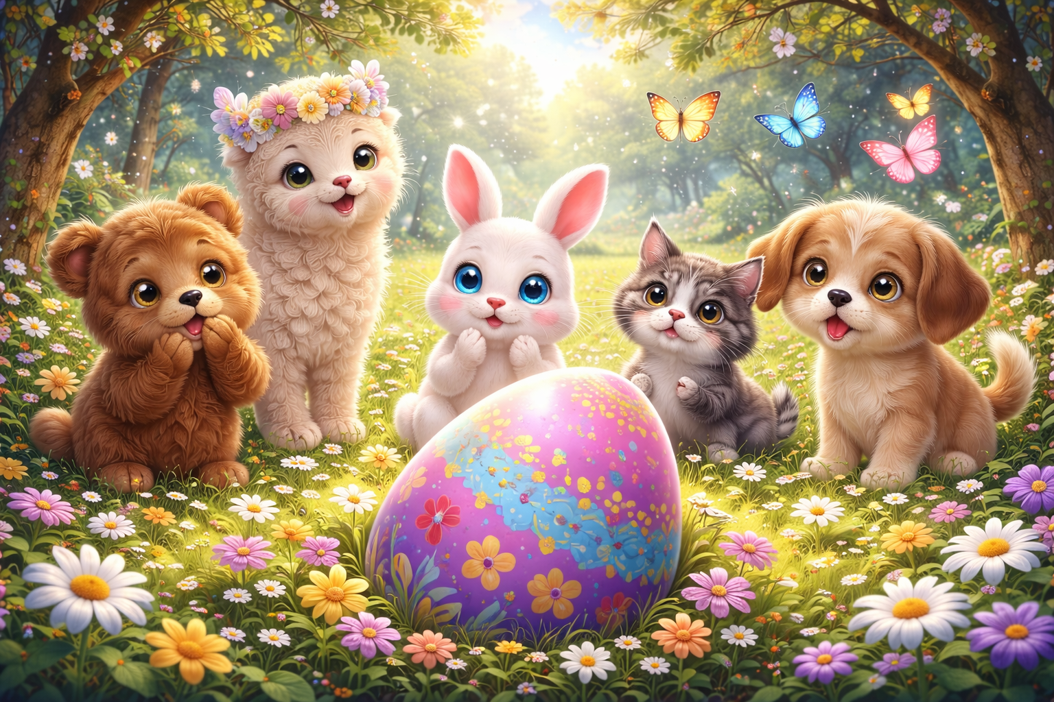 Het was nog steeds Paasdag toen Milo, Luna en Binky samen met hun nieuwe vriendjes verder zochten.